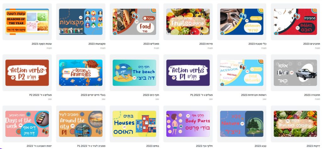 מערכי השיעור שלנו ייחודיים ומרתקים, בהם משולבים מצגות וידאו מהפנטות ומהנות הנכתבות בעברית, אנגלית, “היבריש” ותכני וידאו מגוונים. בכל שיעור אנו משלבים משחקי רשת שנבנו במיוחד, משחקי חברה, משחקי כדור, בינגו, שעשועונים, חידונים ועוד. לסילבוס המלא שלנו לחצו כאן: